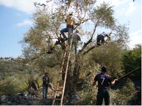 My recording of the conversation was continually interrupted by the ringing of Abu Nabil's small Nokia mobile phone. He kept rejecting the calls, but the caller kept calling back. After five or six attempts, Abu Nabil finally excused himself to answer his phone. When he returned to continue the conversation, he told me it was a neighbor from the village down the hill, Yanoun El Tahta (Lower Yanoun) informing him that Israeli settlers were uprooting a group of ancient olive trees with a bulldozer, while the Israeli military was positioned nearby to protect the armed settlers. He explained that the settlers occasionally came into the olive orchards that are still controlled by Palestinians to uproot the large olive trees in order to replant them in the settlements up the hill. He also said that the settlers would at times simply cut down or burn the ancient olive trees, leaving them to die in the fields. After receiving a couple more calls, Abu Nabil apologetically said he would have to leave and go to stand with his neighbor and try to plead with the soldiers to stop the settlers from uprooting the trees. When I asked if I could go with him, he said that the presence of an outsider could inflame the situation and provoke the settlers and soldiers to forcefully remove us.